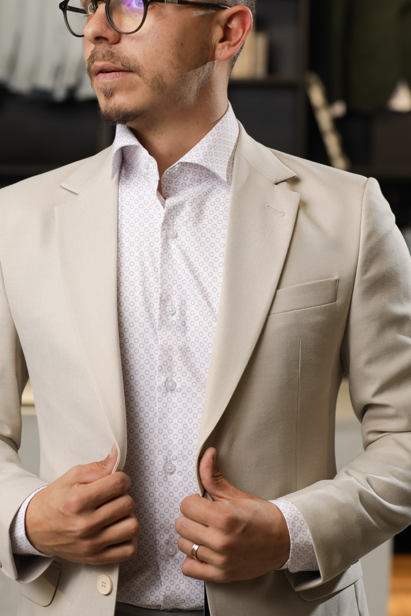 Detaliul care face diferența: Imprimeul Geometric Discret Nu toate evenimentele sau întâlnirile de afaceri cer o cămașă albă simplă. Pentru momentele în care dorești să îți exprimi stilul personal păstrând o atitudine profesionistă, această piesă este alegerea ideală. Imprimeul circular în nuanțe calde de bej adaugă o textură vizuală extrem de interesantă, fără a încărca ținuta. Este o abordare modernă a eleganței, perfectă pentru bărbatul care acordă atenție detaliilor subtile.