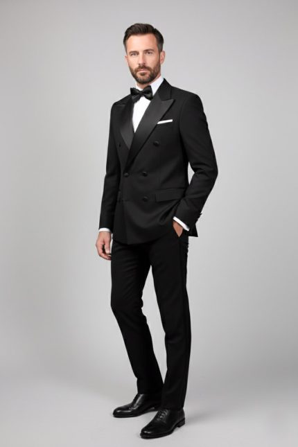 Costum de Mire Jacquard Negru la Două Rânduri – Lână & Bumbac