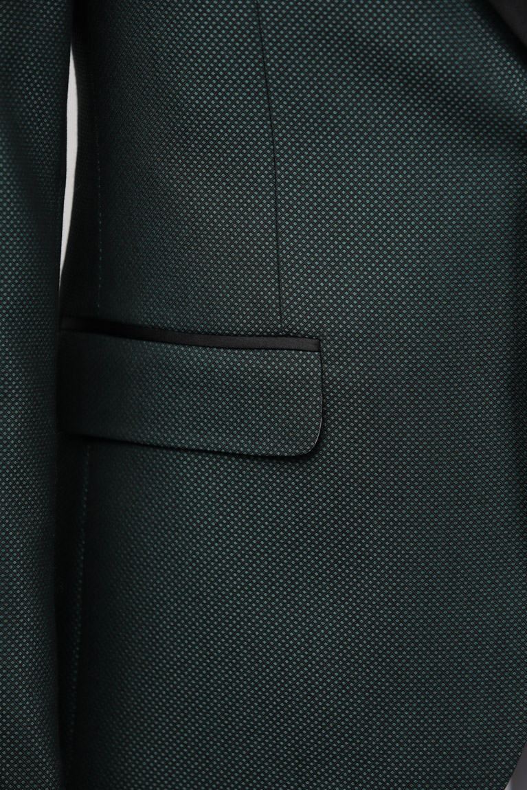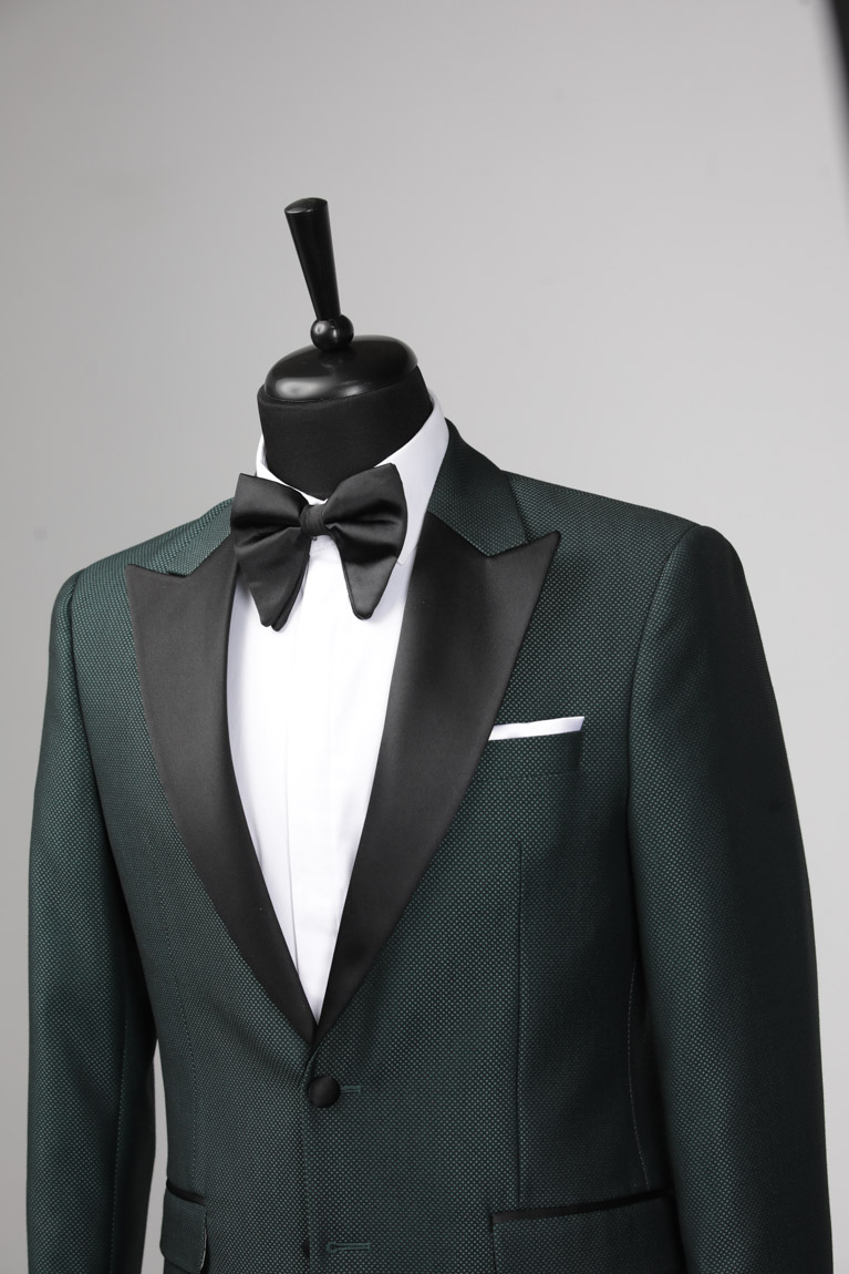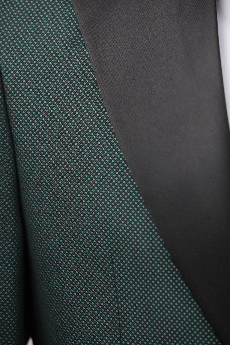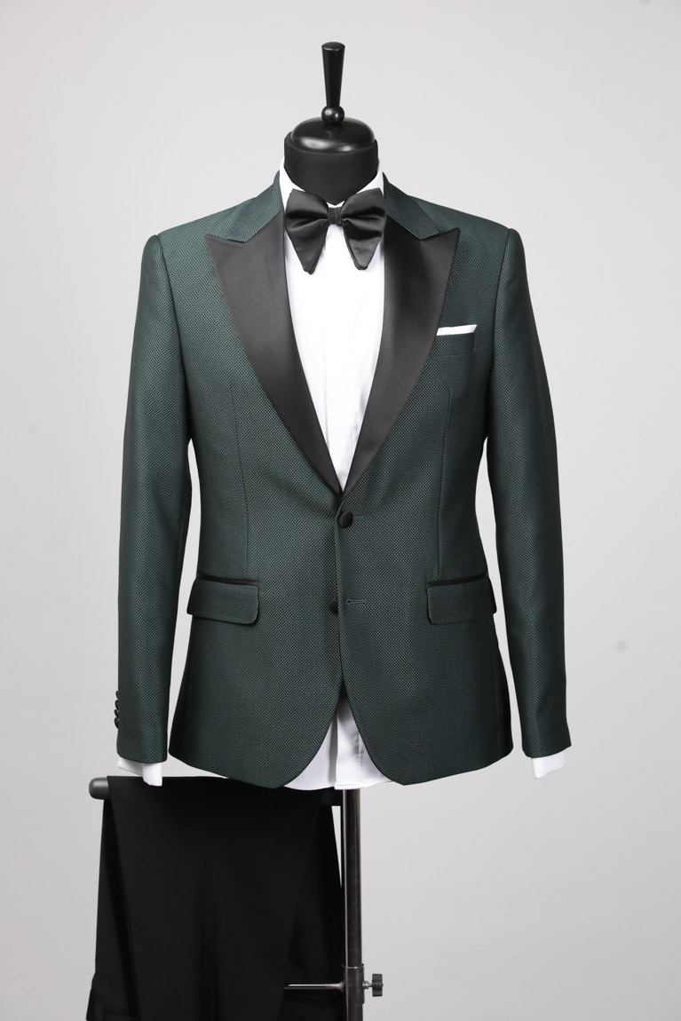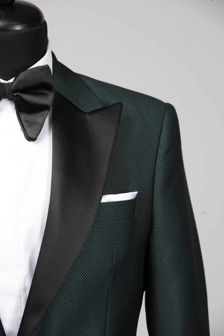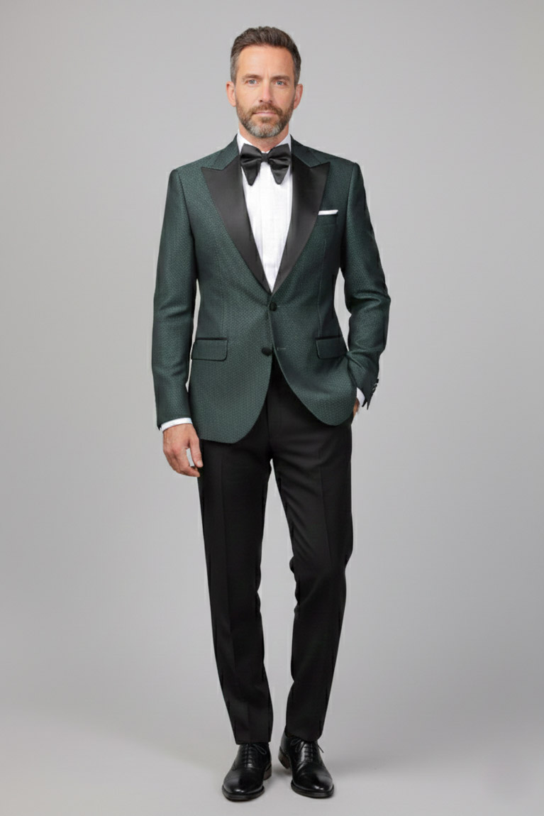 Ansamblu de ceremonie: Sacou verde cu textură fină (micro-pattern) și pantalon negru clasic.