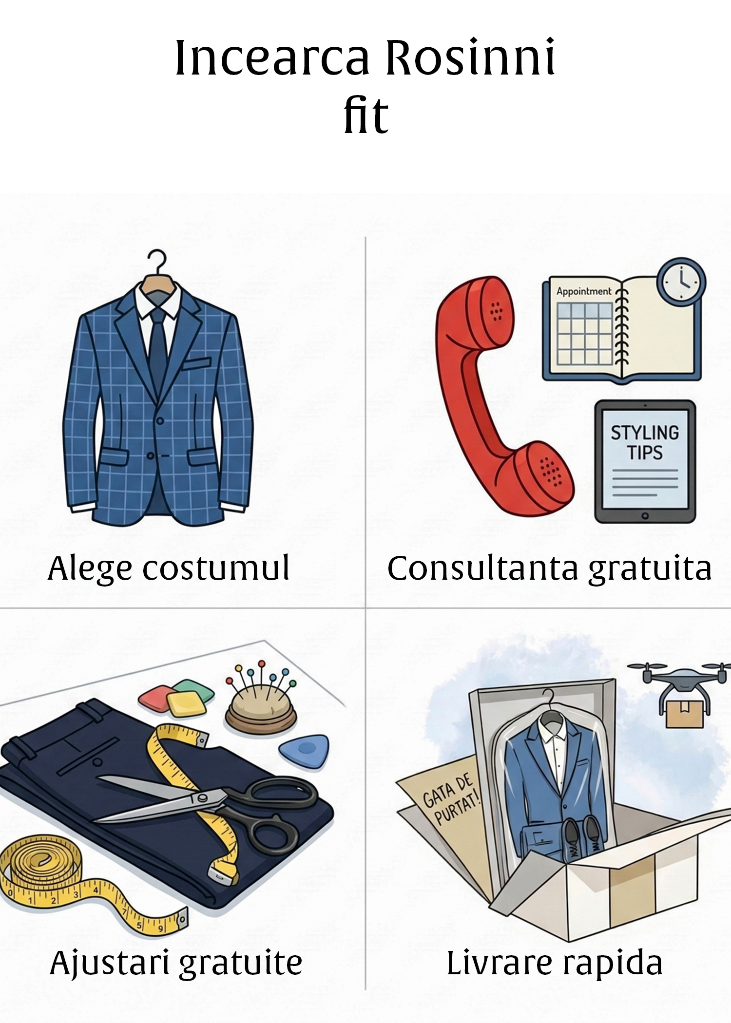 Serviciu Premium Inclus: Ajustăm gratuit sacoul și pantalonul pentru o potrivire perfectă pe conformația ta.