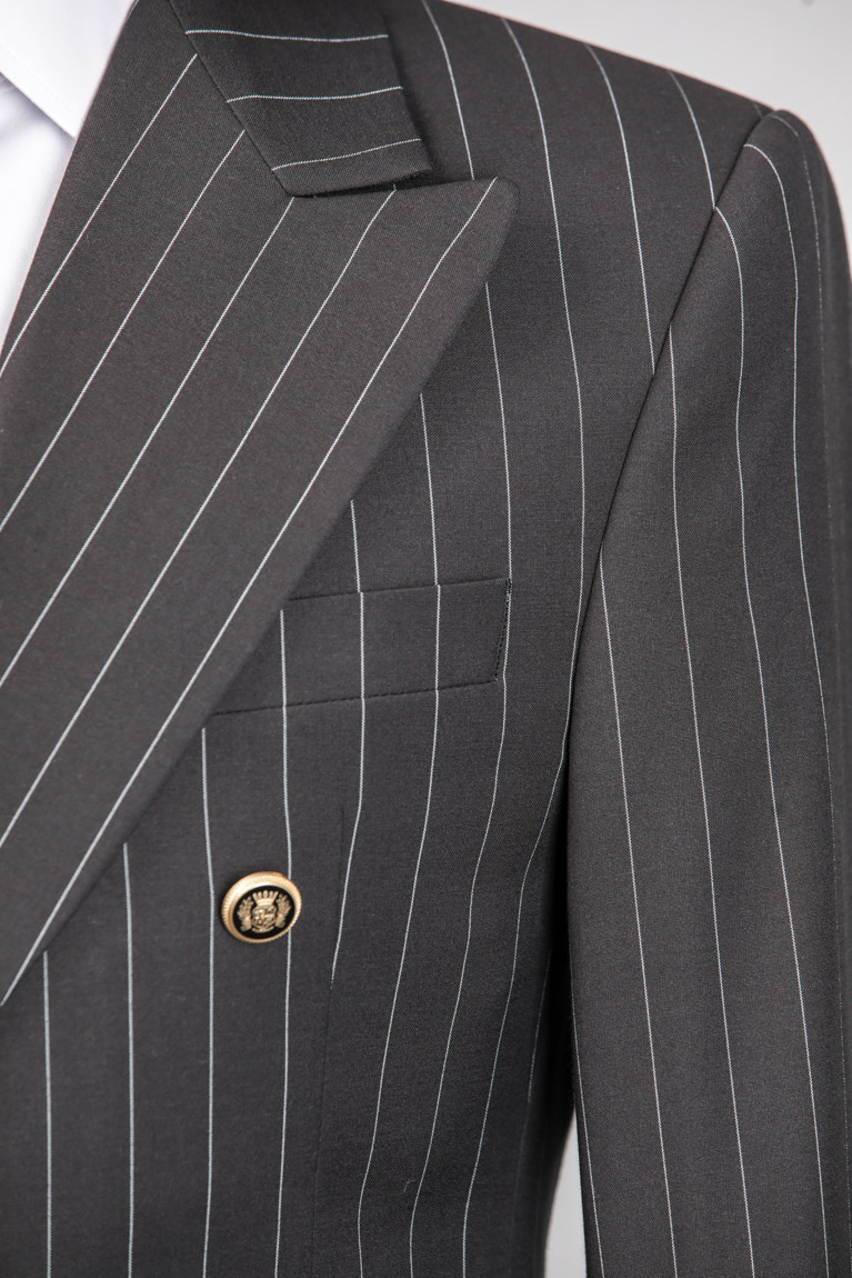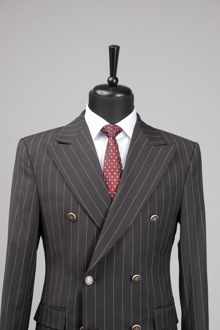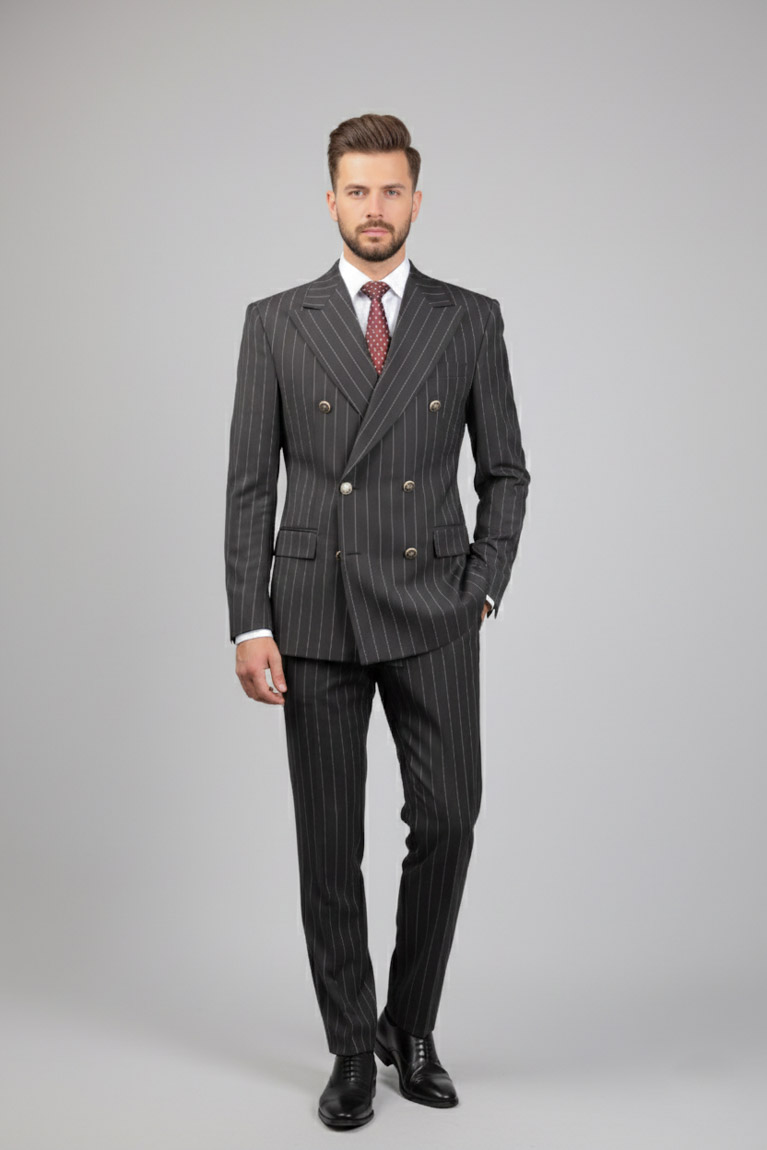 Simbolul suprem al puterii în afaceri Dacă un costum în dungi la un singur rând de nasturi este o declarație de intenție, varianta la două rânduri (double-breasted) este o demonstrație de forță. Combinând liniile verticale – care alungesc și subțiază optic silueta – cu reverul spiț lat și panourile suprapuse pe piept, am obținut o arhitectură vizuală de neegalat. Este uniforma modernă pentru întâlniri decisive, negocieri importante sau evenimente unde prezența ta trebuie să dicteze tonul încăperii înainte de a rosti un cuvânt.