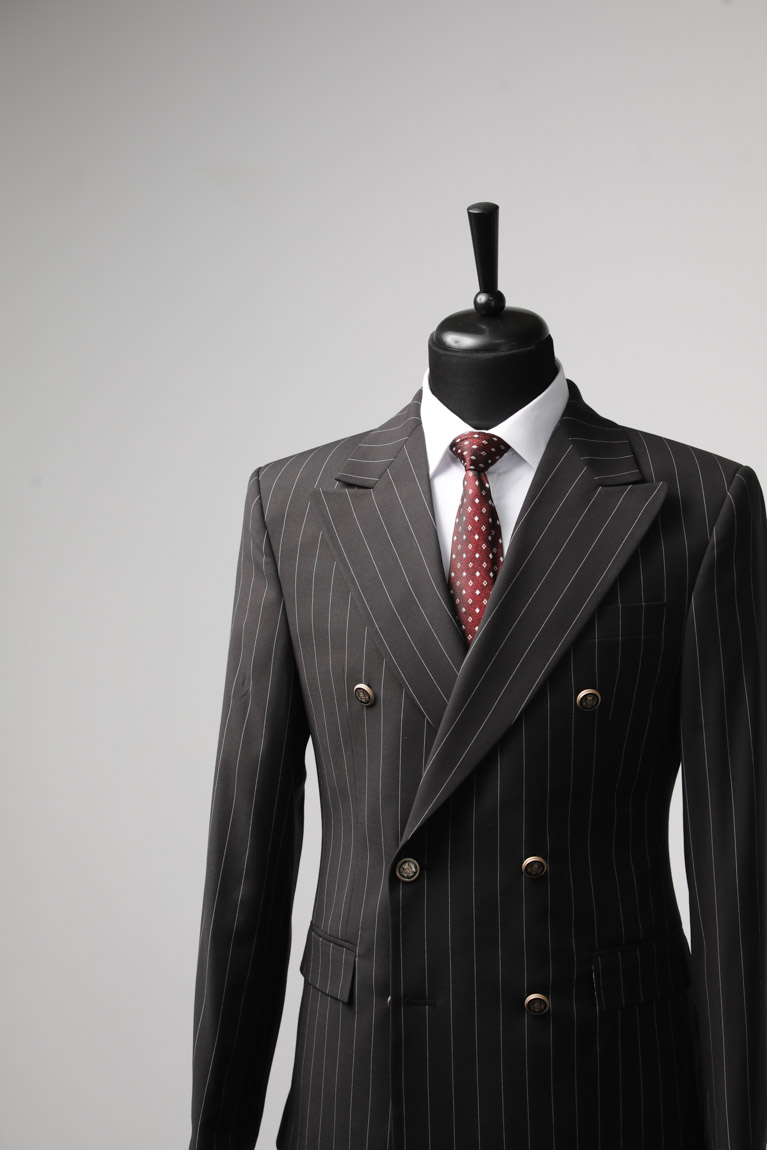 Autoritate absolută: Ansamblu format din sacou la două rânduri de nasturi (double-breasted) și pantalon asortat, cu clasicul model în dungi verticale (pinstripe).