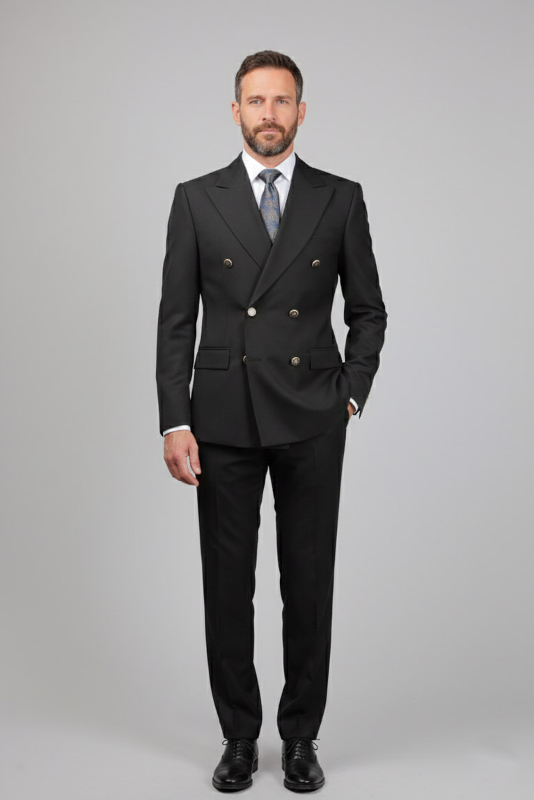 Punctul culminant al stilului masculin Un costum negru clasic este o necesitate, dar un costum negru la două rânduri de nasturi (double-breasted) este o demonstrație de forță. Combinând reverul spiț lat — care lățește vizual umerii și accentuează pieptul — cu o țesătură cu textură fină (micro-pattern), am creat o piesă cu o prezență copleșitoare. Spre deosebire de o stofă plană, textura fină absoarbe lumina diferit, adăugând un nivel de sofisticare pe care cunoscătorii îl observă imediat. Este uniforma supremă pentru întâlniri de afaceri decisive, evenimente formale de seară sau gale unde eticheta cere perfecțiune.